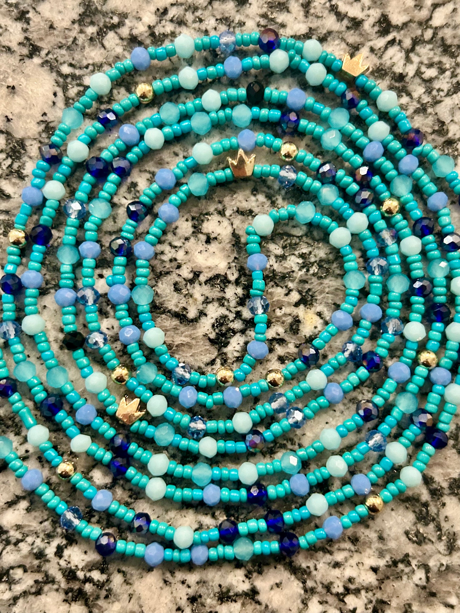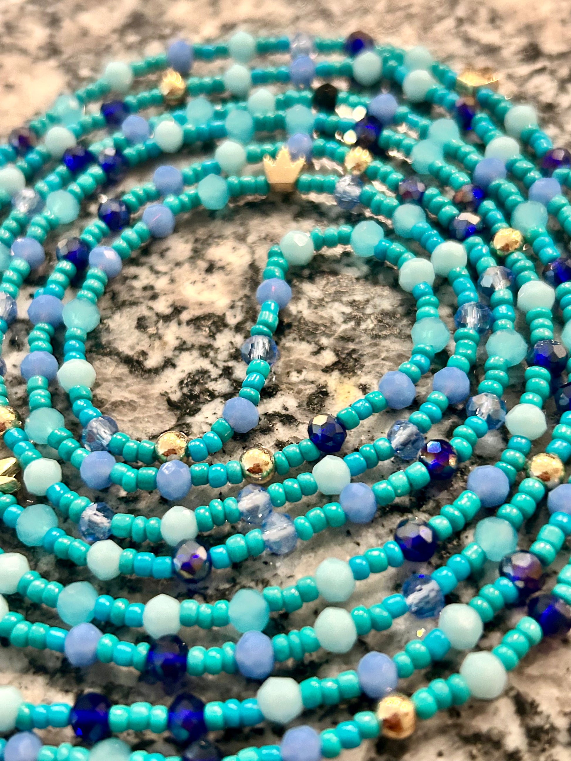 Rule your world in shades of royalty. Aqua Empress blends vibrant turquoise, ocean blues, and sparkling gold accents for a waistbead that’s as bold as it is elegant. With shimmering crown details and crystal-like beads, this piece celebrates confidence, beauty, and divine feminine energy. Wear it as a daily reminder that you are regal, radiant, and unstoppable.