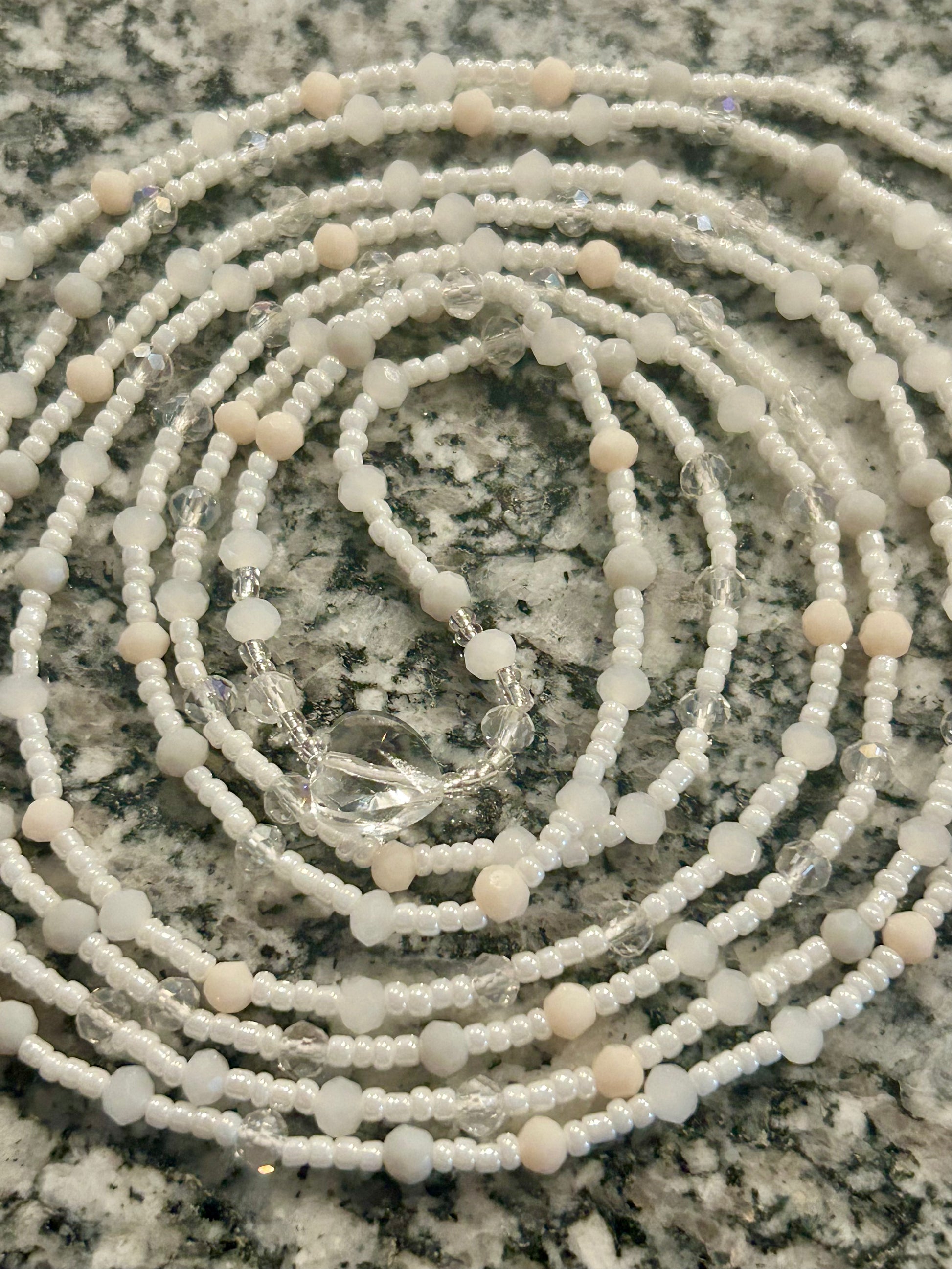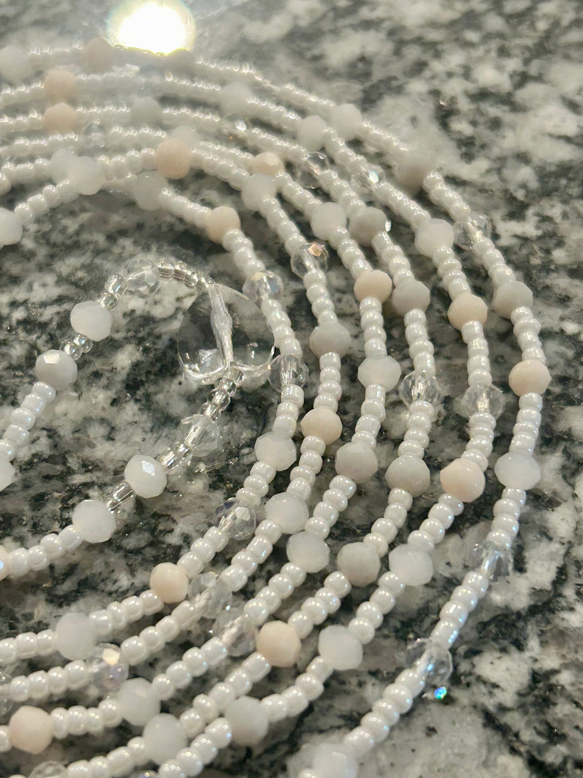 This waistbead design features a delicate mix of pearly white seed beads, creamy champagne tones, and glistening crystal accents that catch the light with every movement. Light as air yet full of presence, Champagne Cloud embodies elegance in its purest form — perfect for adding a touch of sophistication to any outfit or moment. Whether worn as a symbol of beauty, femininity, or confidence, this piece wraps you in a glow as gentle and timeless as champagne bubbles drifting through the clouds.