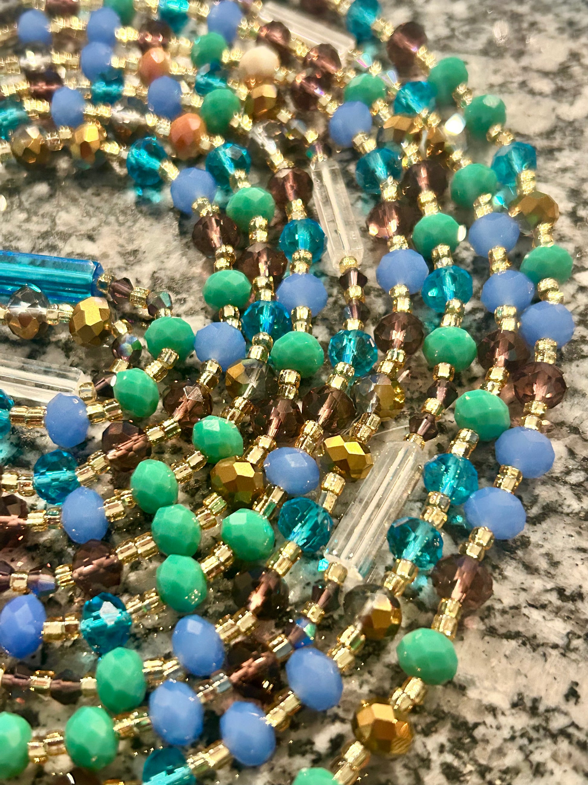 Let the waves meet your waist. Ocean Kiss captures the calm of turquoise waters and the shimmer of golden sunlight. Featuring sea-blue, mint, and amber crystal beads, this strand radiates serenity and allure — like a gentle kiss from the ocean itself. Perfect for the woman who flows with grace, glows with confidence, and moves like water.